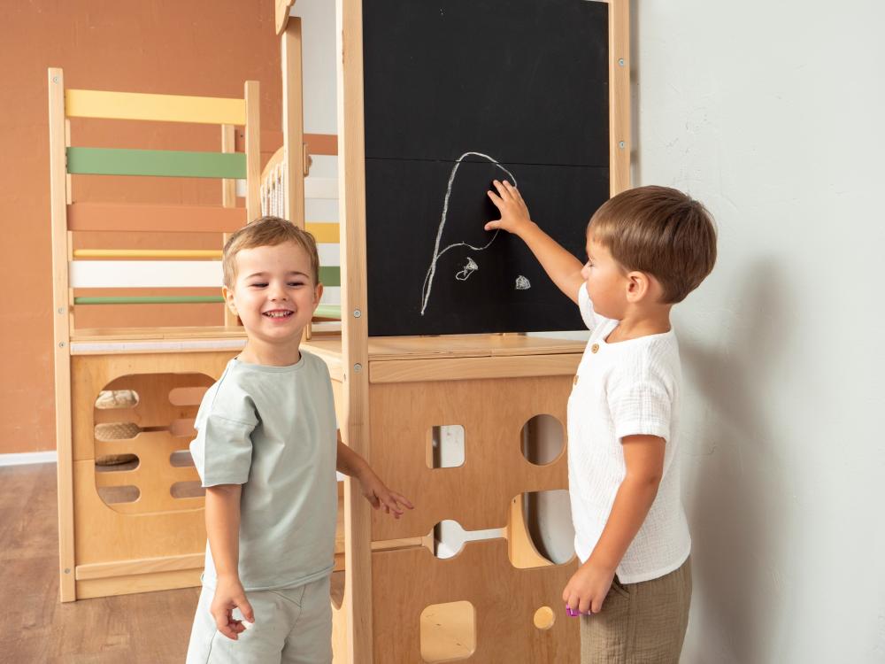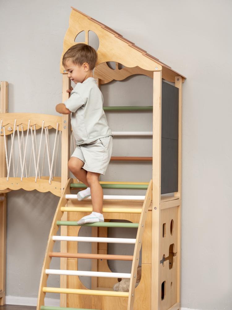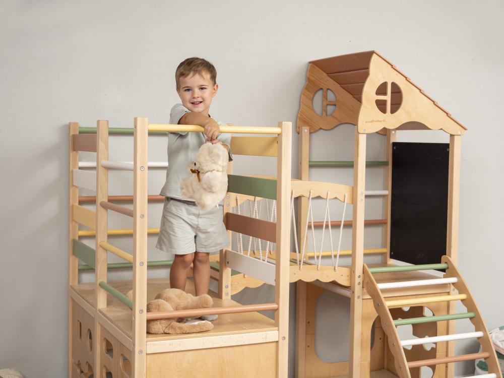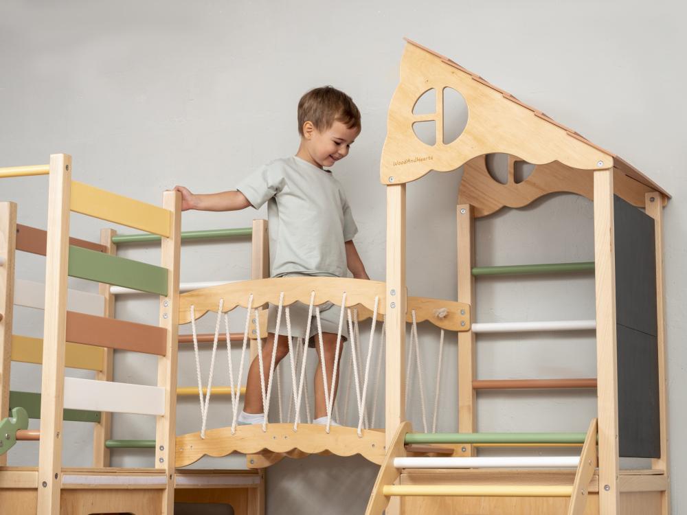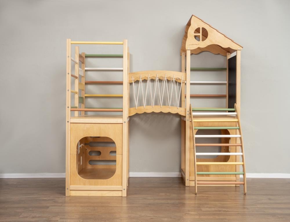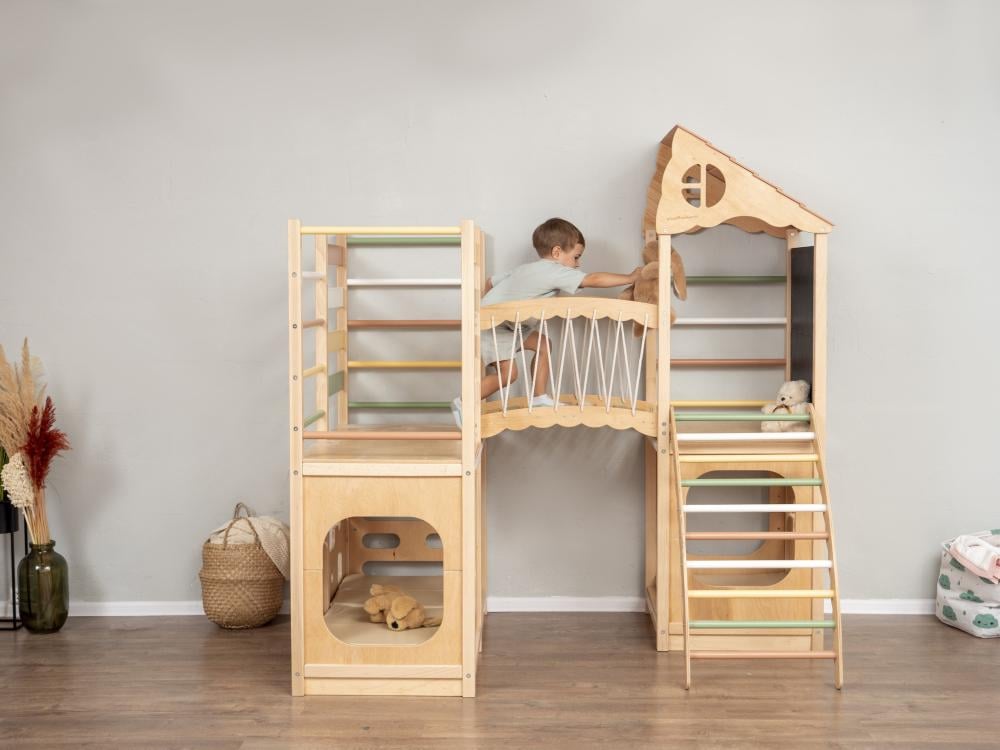 The versatile Indoor Montessori Playground with a Bridge is an exciting structure designed for children aged from 2 to 6 years. This multi-functional climber, with a maximum load capacity of 60 kg, features wooden ladders, a semi-arch, and a safe bridge connecting two tower parts. The playground climber is crafted from high-quality solid beech wood and birch plywood and coated with eco-friendly finishes (hypoallergenic lacquer and water-based paints). Besides active exercises and fun games, this indoor jungle gym offers a chalkboard for creative activities. Two playhouses at the bottom create opportunities for engaging sibling play. Cozy playhouses have plenty of space inside and even feature curtains. The climber includes a ramp-slide and a sports mat, making active play safer by protecting kids from injury. It is perfect for home, daycare centers, or early childhood development rooms.